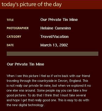 When looking at a friend's Australia photos online, I came across the Kodak.com "Picture of the Day" contest. I thought to myself "I've got tons of pictures to submit. It doesn't cost anything and many of my photos are digital and ready to go . . . so why not submit one?" So I did enter one of those pictures which I call "Our Private Tin Mine":